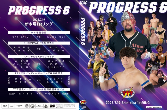 7月27日にTOKYO SQUAER IN ITABASHIで開催をされたPROGRESS 6.5のDVDです。 対戦カード ▼メインイベント 「TTT vs格闘探偵団」(30分1本勝負) 橋之介 vs 野村卓矢 ▼セミファイナル 「TTT vs格闘探偵団」(30分1本勝負) 神崎ユウキvs 阿部史典 ▼第4試合 「TTT vs格闘探偵団」(30分1本勝負) KURO-OBI vs 一般人・澤宗紀 ▼第3試合 「TTT認定インディー統一6人タッグ選手権試合」(60分1本勝負) 【王者組】大家健 & ツトム・オースギ & バナナ千賀 vs 新納刃 & 中野貴人 & 神野聖人 with松澤さん【挑戦者組】 ▼第2試合 「スペシャル6人タッグマッチ」(30分1本勝負) ガッツ石島 & マスクドミステリー vs 松崎和彦 & ザ・グレート・タケル ▼第1試合「板橋闘会始」(15分1本勝負) 瀧澤晃頼 vs 塚本拓海